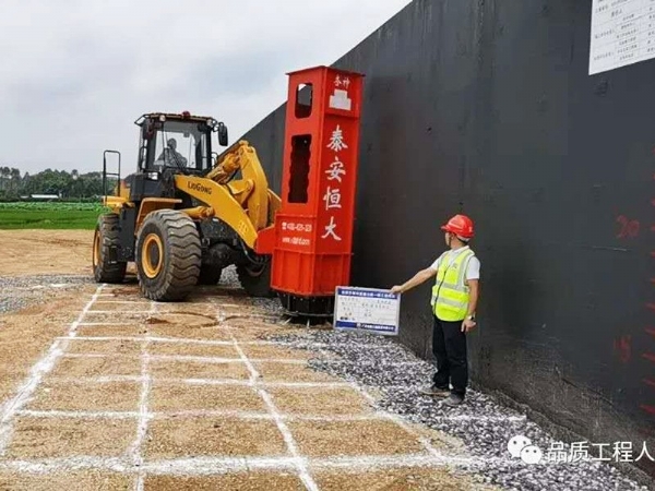 層厚標(biāo)記采用定制15cm紅白相間的反光貼紙控制層厚,并公示臺(tái)背責(zé)任卡,使用高速液壓夯實(shí)機(jī)進(jìn)行夯實(shí),提高涵背填筑質(zhì)量。